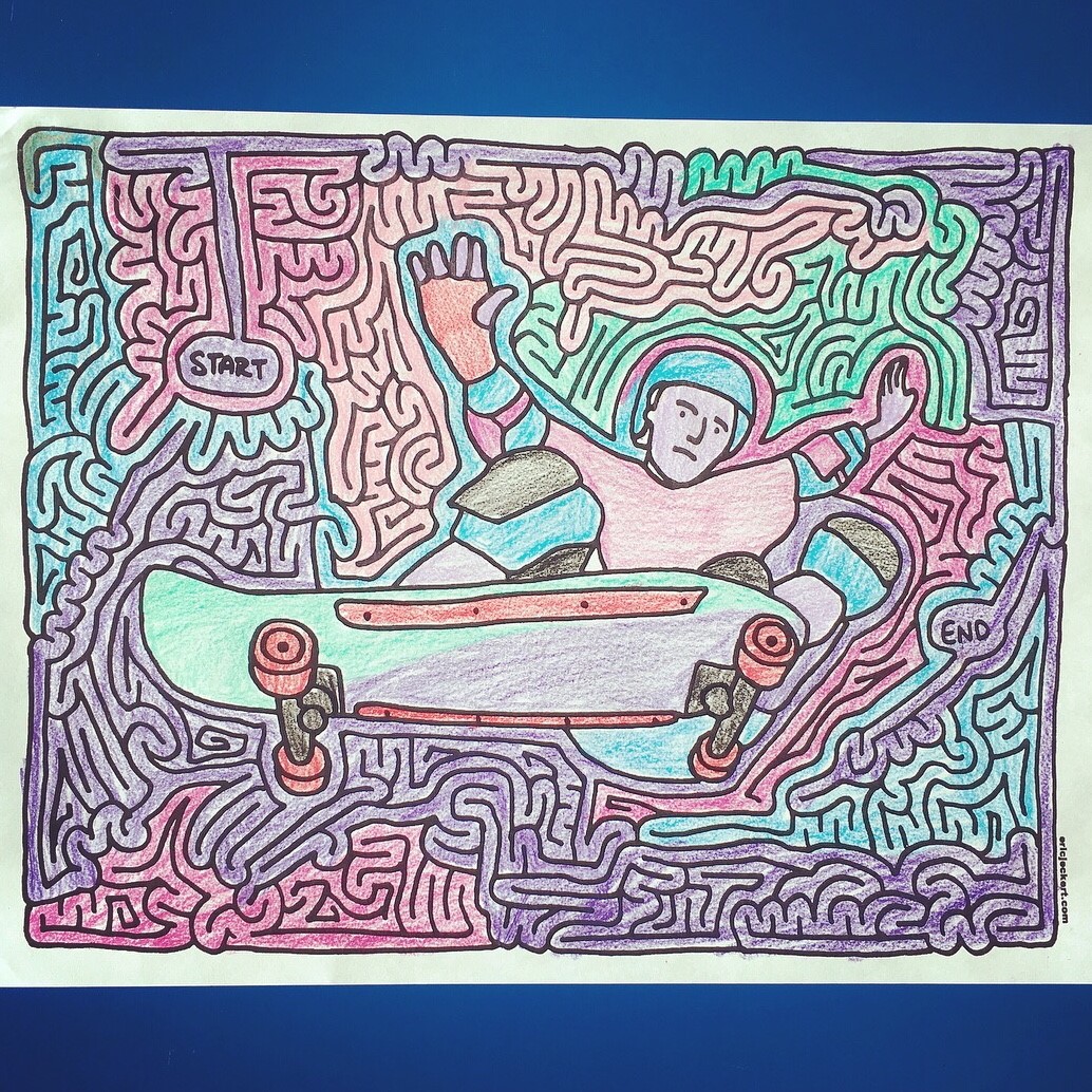 My first skateboard was a 70's cruiser that was lovingly refurbished by my grandpa to give to me at Christmas. Unbeknownst to me at the time, that little red board was the catalyst for so much learning and self-discovery. This week I've had the joy of reading and sharing @myfirstskateboardthebook with our William Watson students. Karl Watson's messages of perseverance and inclusivity are accentuated with charming illustrations by Henry Jones. I also owe a big thanks to Eric Eckert for allowing us to colour his captivating maze drawings like this one of skate legend, Danny Way.